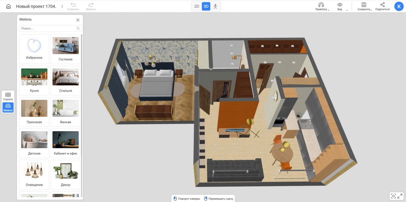 РумПлан 3D выделяется простым интерфейсом и возможностью быстро делиться проектами по ссылке. В программе есть коллекция мебели на 800+ предметов и база отделочных материалов с 1600+ текстурами. Вы сможете создать любую планировку жилья — с нишами, проемами, колоннами и какой угодно формы. Для оценки результата предлагается функция виртуального визита. Если все устроит, проект легко экспортировать в PDF или сохранить как трехмерную модель.
