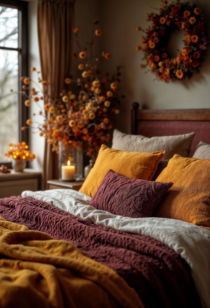 Вязаные пледы, яркие подушки и покрывала осенних оттенков согреют в холодную погоду, важно сочетать классические осенние цвета с пастельными: слишком много ярких красок будут перегружать интерьер.