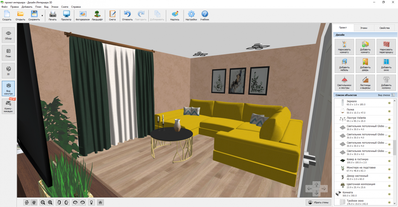 Создать проект можно в программах для дизайна интерьера. Например, Дизайн Интерьера 3D. Она имеет интуитивно понятный интерфейс, доступный даже тем, кто не представляет, как сделать дизайн-проект квартиры самостоятельно. Софт позволяет: