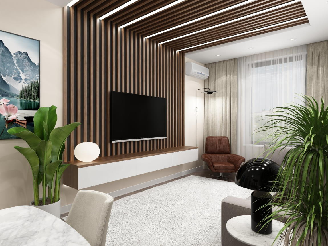 Еще для зонирования подходит отделка. Это касается и пола, и стен. Уложив в одной части гостиной паркет, а в другой — керамогранит, можно отделить ТВ-зону от обеденной. А разместив на стене реечное панно, легко усилить эффект от такого разделения.
