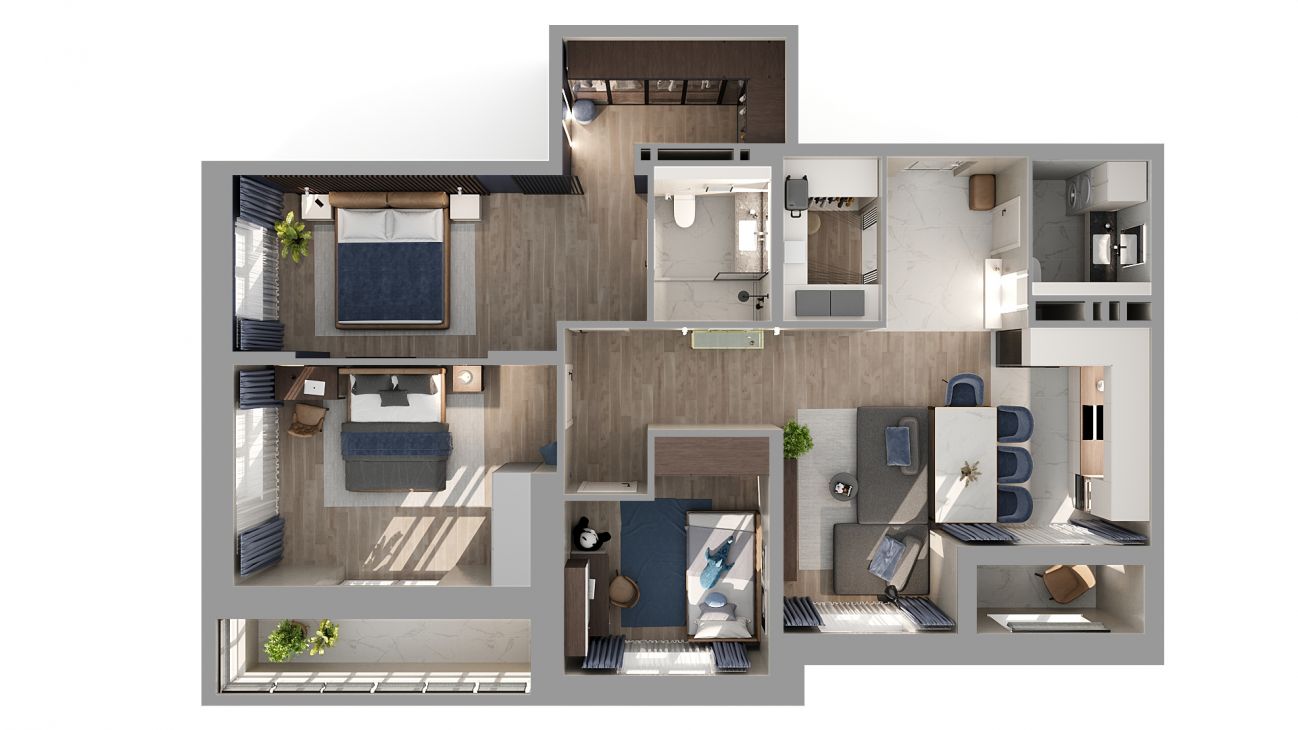 Центральное расположение главной гостиной зоны, плавно соединяющей кухню и обеденную часть, делает пространство открытым, позволяя удобно общаться с гостями или семьей во время приготовления пищи или общения. Планировка включает в себя три спальни, каждая из которых предлагает уединение и комфорт. Расположение двух из них с одной стороны от общей зоны, а третьей — чуть отдаленной, создает баланс между социальными и приватными зонами. Это делает пространство идеальным для большой семьи